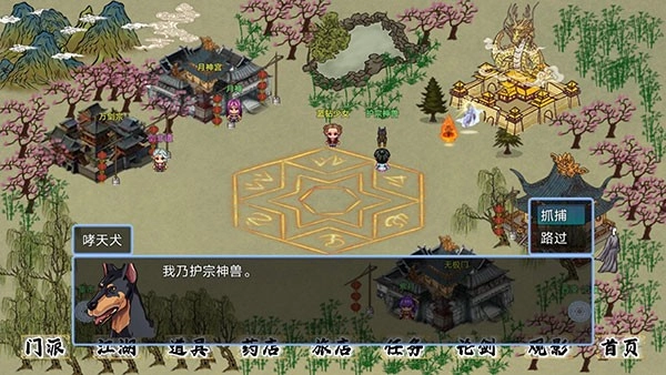 1、玩家进入游戏后,在首页位置,首先前往武林盟拜师,可选择万剑宗、月神宫、无极门。这三个门派的技能各有特点,万剑宗的剑意对应攻防,月神宫的月之圣光可用于回血,无极门的无极剑法属于群攻技能。在这里,建议玩家选择学习剑意,并顺便带走护宗狗子。