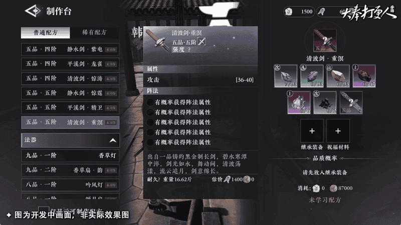 俗话说神兵难得,其品质与出现概率各不相同。通过锻造兵器有机会打造出极品武器,然而兵器品质越高,打造成功的概率就越低。所幸的是,“打造失败”并非意味着武器会损坏,仅仅是无法得到品质更优的武器。