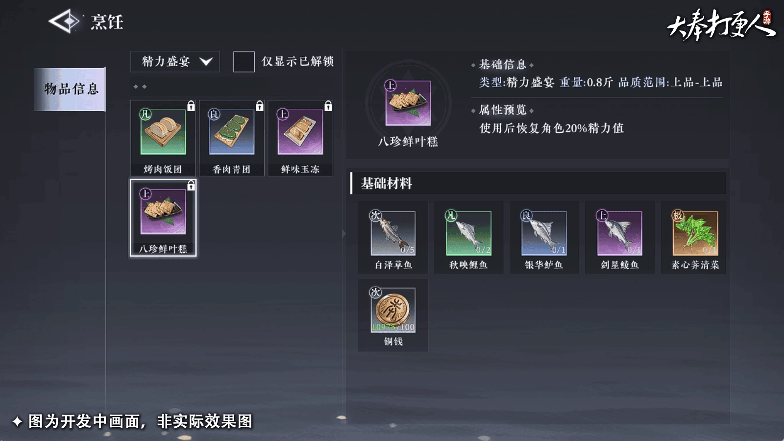 烹饪之道,在于对各类精湛厨艺的不懈追求。经由他们精心烹制的菜品,不仅能够补充精力,还能赋予食客各种增益效果,期望食用者借此周身舒畅,从容应对大奉江湖中的每一场挑战!