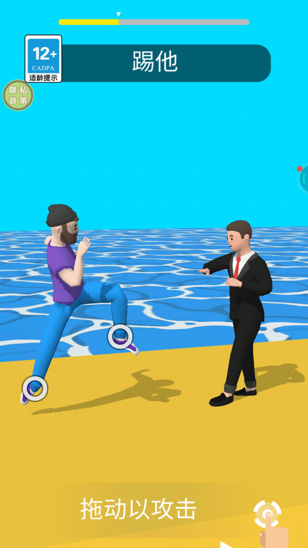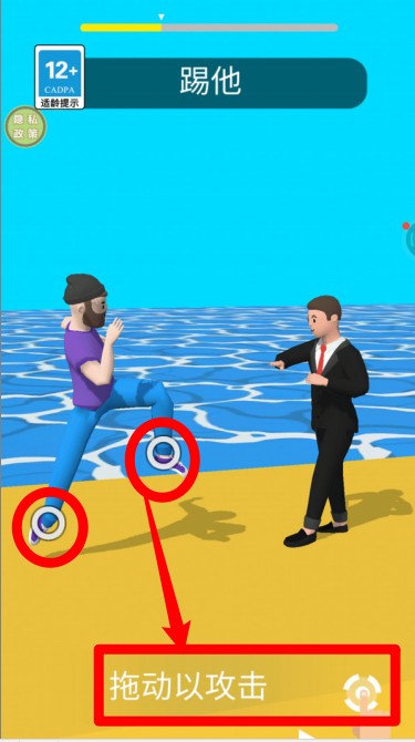 3. 按照画面所显示的“踢他”提示,通过拖动腿部图标,就能完成踢击动作。
