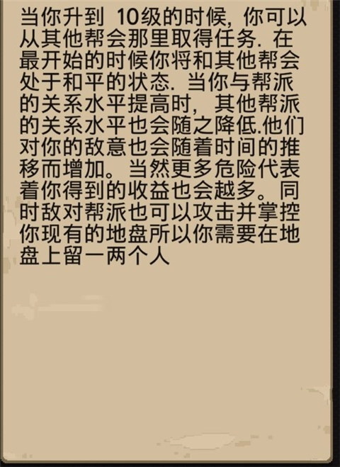 《帮派模拟》是一款趣味性十足的模拟经营养成游戏。游戏围绕帮派养成展开,玩家在其中会化身为帮派头目。玩家需借助持续招募小弟、完成各种任务等途径获取金币,进而逐步扩大自身帮派规模。待玩家积累了足够实力,就能朝着正规产业进军,兼并其他帮派,实现对整座城市的掌控。