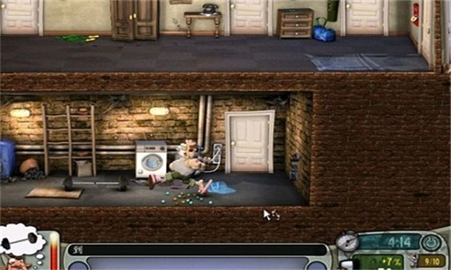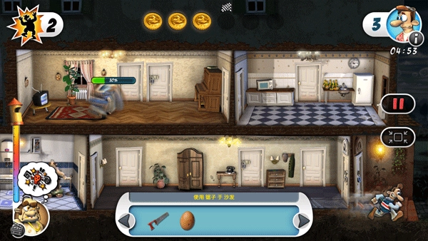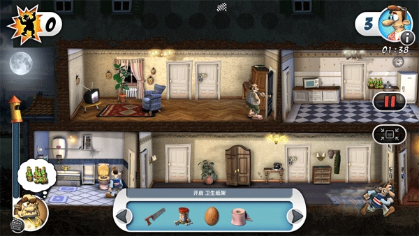 收集道具阶段:开场动画中,伍迪刚一进门,便迅速在柜子里拿到保险丝和弹珠,旋即前往二楼厨房,从厨房垃圾桶里获取到白色的电缆。此时,邻居往三楼去了,先不用理会。伍迪要立刻从厨房前往地下室,先在工具台上拿到绿白相间的钳子,接着到中间位置打开热气阀,随后往右关闭水闸,之后马上上楼并躲进衣柜里面。请注意,上述所有动作需在45秒内完成,否则时间就来不及了。