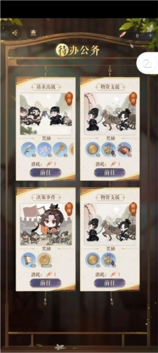 9、据鸢报消息,代办公务时,优先选择出战,如此能够获取资源,其次可选择物资支援(紫色材料,材料箱4 )