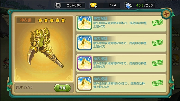 神农锄能够提升农场宠物体力,并提高种植上限。