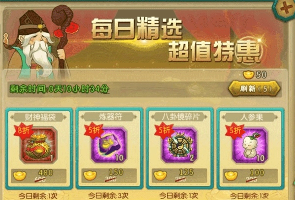 完成兑换后,能够继续消耗元宝刷新商品。首次刷新需10元宝,此后每次刷新所需元宝数递增1元宝,刷新后可再次进行一次兑换。