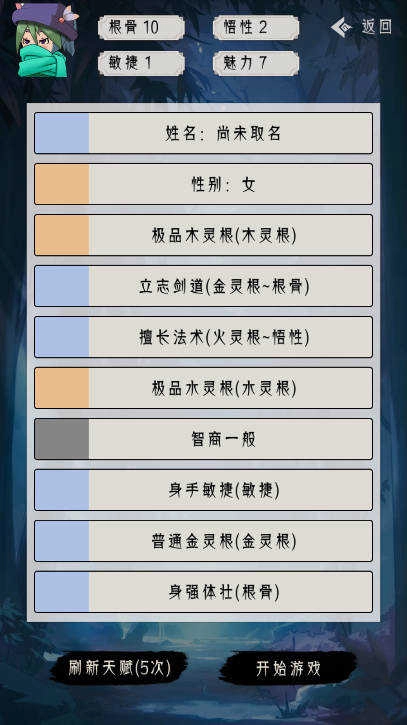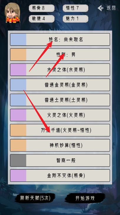 2、然后取名选择你的属性,有不同的天赋可以选择