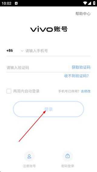 3、要是没有vivo账号,点击【注册账号】进行创建;要是想用密码登录,就选择【密码登录】来切换登录方式。