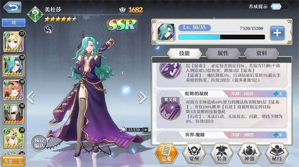 在这个游戏里,每个 SSR 角色都独具特色,实力都颇为强劲。游戏前期,手头有哪个 SSR 就用哪个。不过,一定要练一个法术输出、一个坦克(盾)以及一个物理输出,这些在刷材料副本的时候会派上用场。当前版本,奶妈在队伍中的存在感不算高。组建阵容时,优先凑出 3 个同属火属性的角色,其他位置则依据已上阵的角色,凑出第二种 3 属性加成。还是那句话,有什么 SSR 就用什么,由于楼主卡牌收集不全,就不对每个 SSR 逐一进行点评了。梅林这个角色强不强,完全取决于装备,要是装备厉害,输出就会非常可观;要是装备一般,那作用也就普普通通。有些人喜欢梅林这个初始角色,是因为梅林的爆率极低,并非是觉得梅林强度超高。就现阶段而言,强度极高的角色是赠送的路西法,要是有就练起来,肯定不亏。