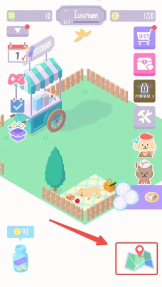 1. 在本站下载并安装猫猫狗狗冰淇淋游戏,安装完成后打开游戏,进入游戏界面后,点击右下角的地图。