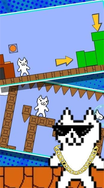 火柴人与猫里奥这款游戏,整体操作玩法既简单又有趣,其玩法和超级玛丽颇为相似。每个游戏关卡里都存在大量隐藏设计,玩家得通过反复尝试,去发现各类机关陷阱,进而成功抵达终点。
