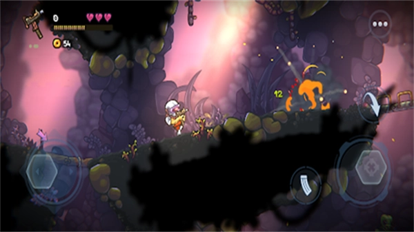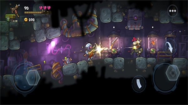 2. 通过左侧屏幕的摇杆来操控英雄,于右侧屏幕进行瞄准并维持攻击方向,图标为箭头的按键代表跳跃操作。