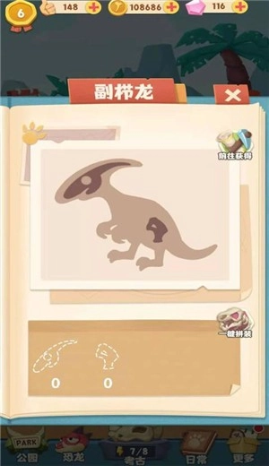 1游戏刚开始时,你得借助化石挖掘功能,收集埋藏于地下的各类化石,然后对其进行提炼进化,最终成功培育出恐龙幼崽。