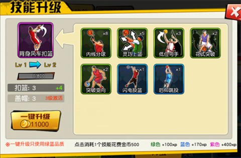 在游戏《街篮》里,技能品质依据颜色来区分,分别为绿色、蓝色以及紫色。技能升级仅仅提高等级,并不会让品质得到提升,所以推荐直接培养紫色技能。