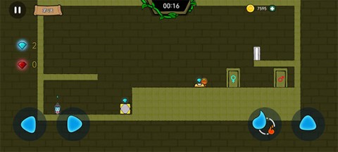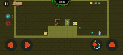 3、在冒险历程里,你会碰到许多有用的道具。举例来讲,有一块石头,玩家得操控火娃娃把石头推落,如此冰娃娃方可顺利跳到石头上面。