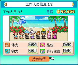 员工具备四项属性,分别为体力、品位、钓力以及步行速度。提升员工属性的途径有多种,其一,可借助使用四种卷轴与强化饮料来实现(其中,卷轴需完成顾客目标方可获取,强化饮料则要通过商会购买得到);其二,钓鱼也能增加属性;其三,员工日常于岛屿上工作时,有一定几率提升属性;其四,获得新的员工道具同样能够提升员工属性。
