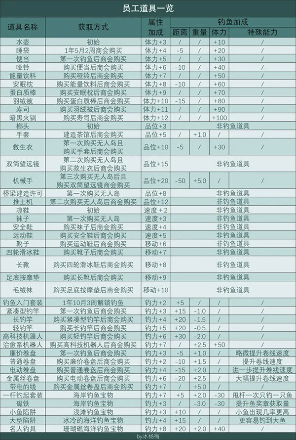 获取新的员工道具能够提升员工属性,有部分员工道具可在钓鱼时装备,以此改变钓鱼的三项属性。