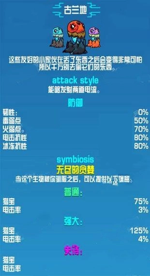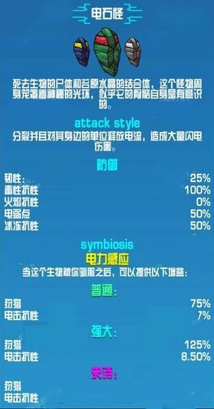 崩溃大陆第三世界的生物,同时也是崩溃大陆截至目前的最后一种生物。它具备两种攻击方式,其一为发射电元素球,其二是在自身周围生成一个领域。由于它拥有电属性,所以能够对目标造成多段伤害,是极其强大的存在。不仅如此,它还拥有特殊的寻宝幸运加成,称得上是这款游戏里最为好用的宠物。