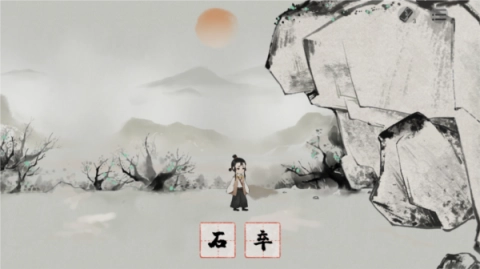 1. 引导主角向右,与驻守的士兵交谈完毕后,把士兵形象以及旁边的石块纳入物品栏,分别得到“石”字和“卒”字,二者结合生成“碎”字,将其应用在石块上。