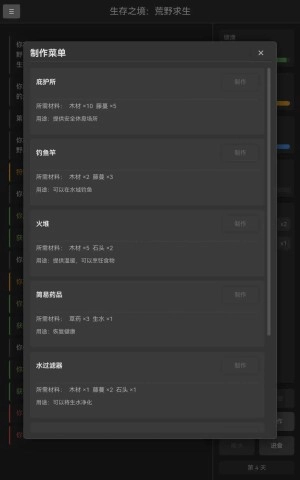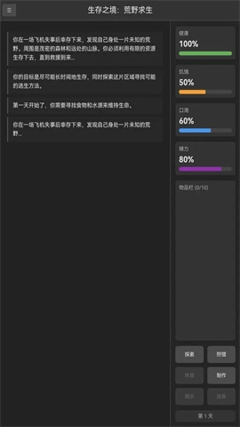 《生存之境:荒野求生》是星语工作室发行的一款生存冒险游戏。在游戏里,玩家的健康、饥饿、口渴以及精力等生存状态信息,会以百分比进度条的形式在屏幕右侧展示。玩家收集到的资源,都会存放在物品栏中,且所有相关信息均以文字形式呈现。玩家通过屏幕右下角的选项,能够选择各类生存行动来获取资源,与此同时,游戏会记录玩家生存的天数。