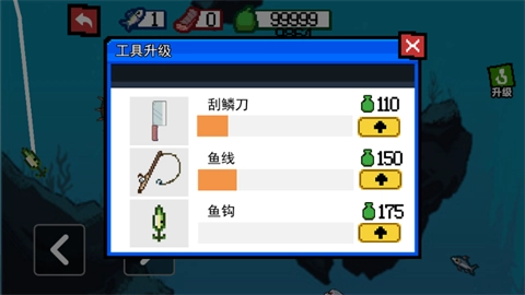 1、鱼钩、鱼竿和刮刀都能够进行升级,而升级所需的花费可不低,需要不少钞票。