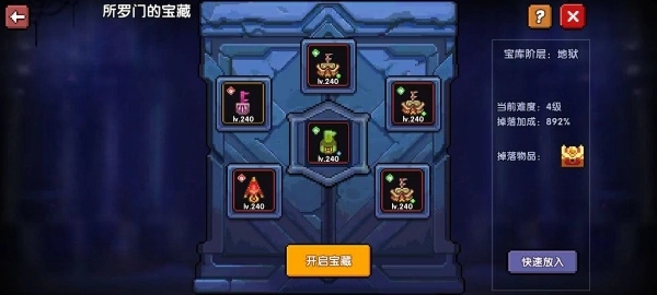 所罗门:近期备受关注的所罗门,所指的乃是所罗门的宝藏,其每隔两三个月开启一回。开启的前三天,武器碎片的掉落数量翻倍。血石头的掉率与带有120加成的钥匙相近。这里是刷钥匙的最佳去处。要是并非万分急切,那就囤着钥匙,等所罗门活动开启时再去打,通常情况下,消耗6把钥匙能获取一把武器。