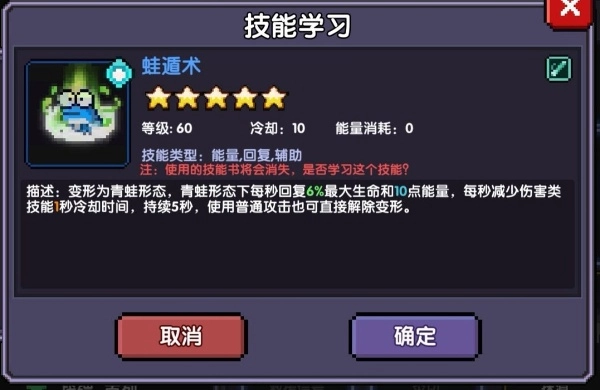 【蛙遁】:此乃忍者技能蛙遁术,施展后能够变身为青蛙。变身为青蛙状态时,每秒可回复自身6%的最大生命值以及10点能量,该变身状态的持续时长为5秒。此外,进行普通攻击即可解除变身。