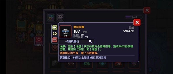 2、湛蓝军帽:此头部装备仅能从96层以上秘境掉落的箱子中开出。它的特效为冰爆,当击败处于冰缓状态的敌方时,会将其引爆,造成590%的武器伤害,同时附加冰冻与冰缓效果。