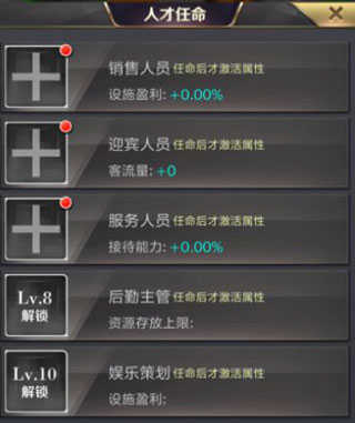在服务中心,通过人才任命能够提升收益,4级服务中心方可解锁此功能。人才的经营能力越强,收益加成也就越高。需留意的是,一旦将人才派遣至海外服务中心,便无法再将其安排到店铺中。在此推荐,销售人员与服务人员选用经营能力高的人才,而对于迎宾人员,不太建议使用经营能力高的人才,原因在于客流加成的性价比偏低。