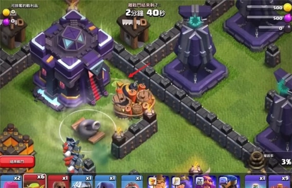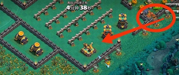 当等待的援军抵达前城堡就被打掉时,要在靠近城墙的那一侧放下一个超级哥布林,以此引出飓风陷阱。务必注意,一定要在靠近城墙的这一侧投放超级哥布林,原因是另一侧的陷阱数量极多。