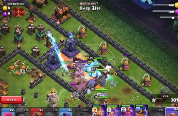 8、大部队在红色圈内全部投入,等援兵都出来后,挑个合适时机开启男王和永王的大招。剩下的两个隐形法术,留着给女王拆大本的时候用。到这一步就可以安心等三星了。要是前戏进行得不错,女王拆掉大本后还剩半管血并且大招也还在,闰土同样留着大招,四个王都存活,那么右上角的地狱塔和两座特斯拉电塔,就算旁边有大量骷髅和皇家幽灵,也完全能拆掉。
