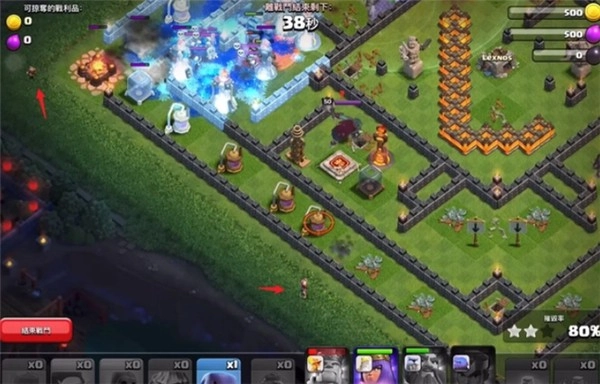 4、女王在拆除建筑工人小屋后,会接着去拆除两座炸弹塔和X弩。这个时候,位于上方的两名女武神并不在这三座建筑的攻击范围之内,因此女王能够很好地维持较高的血量。