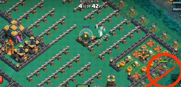 5、当女王拆除炸弹塔时,在下方的红色方框内放置约10个南瓜头野蛮人,以此吸引X弩的仇恨。如此能进一步确保女王和女武神保持良好状态。