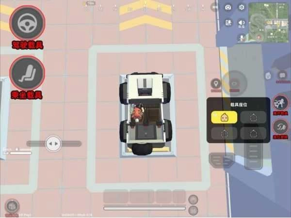 当进入载具后,「载具操作按钮」会消失不见,取而代之的是「载具驾驶按钮」「离开载具按钮」以及「换座按钮」(点击此按钮会弹出座位选择框)。