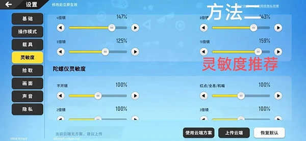 鉴于使用的是二指操作,灵敏度不妨适当调高一些,这样在与敌人近距离作战时,就能更迅速地转动视角。(以下是我个人的灵敏度设置,分享推荐给大家,此为方法一。)