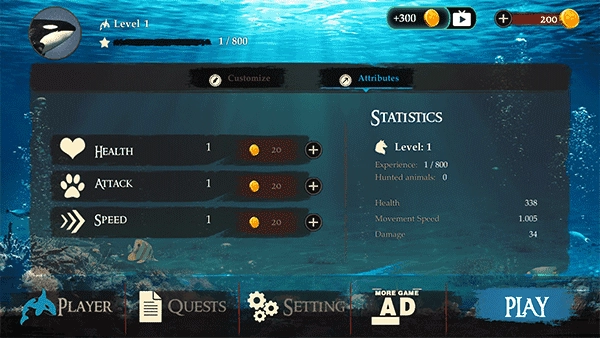 2. 消耗金币能够增添属性点,还能查看虎鲸的详细数据,点击“play”即可开启游玩。