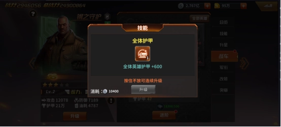 想要在前中期提升战力,有两条捷径。其一,持续获取英雄,提升军力等级,以此提高战力。其二,升级战车,特别是增强具有全体属性加成的战车技能,其中全体护甲对战力的提升最为显著。