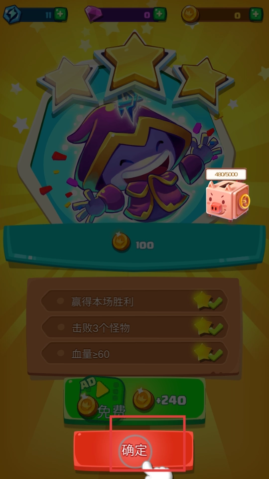 4、取得胜利后,查看任务完成状况,点击【确定】,领取金币等各类奖励。