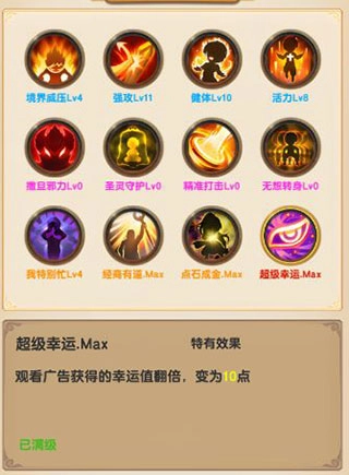 关于天赋加点,设计得相当人性化。只需看完30个广告,就能随意重置,想用哪种天赋组合都可以。个人建议在看广告期间,优先加上超级幸运,以此提升幸运值。
