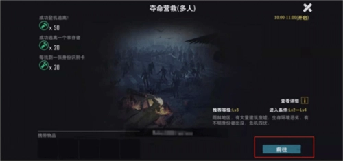 在游戏设定的开启时段内,进入游戏后点击“前往”,将会出现相关温馨提示。各位幸存者可在出发前着手准备备战物品,点击“前往仓库”,备好所需物资并带入游戏中。