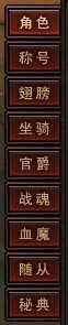 点击下方动作条上的“角色”按钮,或者按下快捷键C,打开后左边展示的全是你之前的进阶项目。这里面除了“角色”选项单之外,还包含:称号、翅膀、坐骑、官爵、战魂、血魔、随从、秘典。