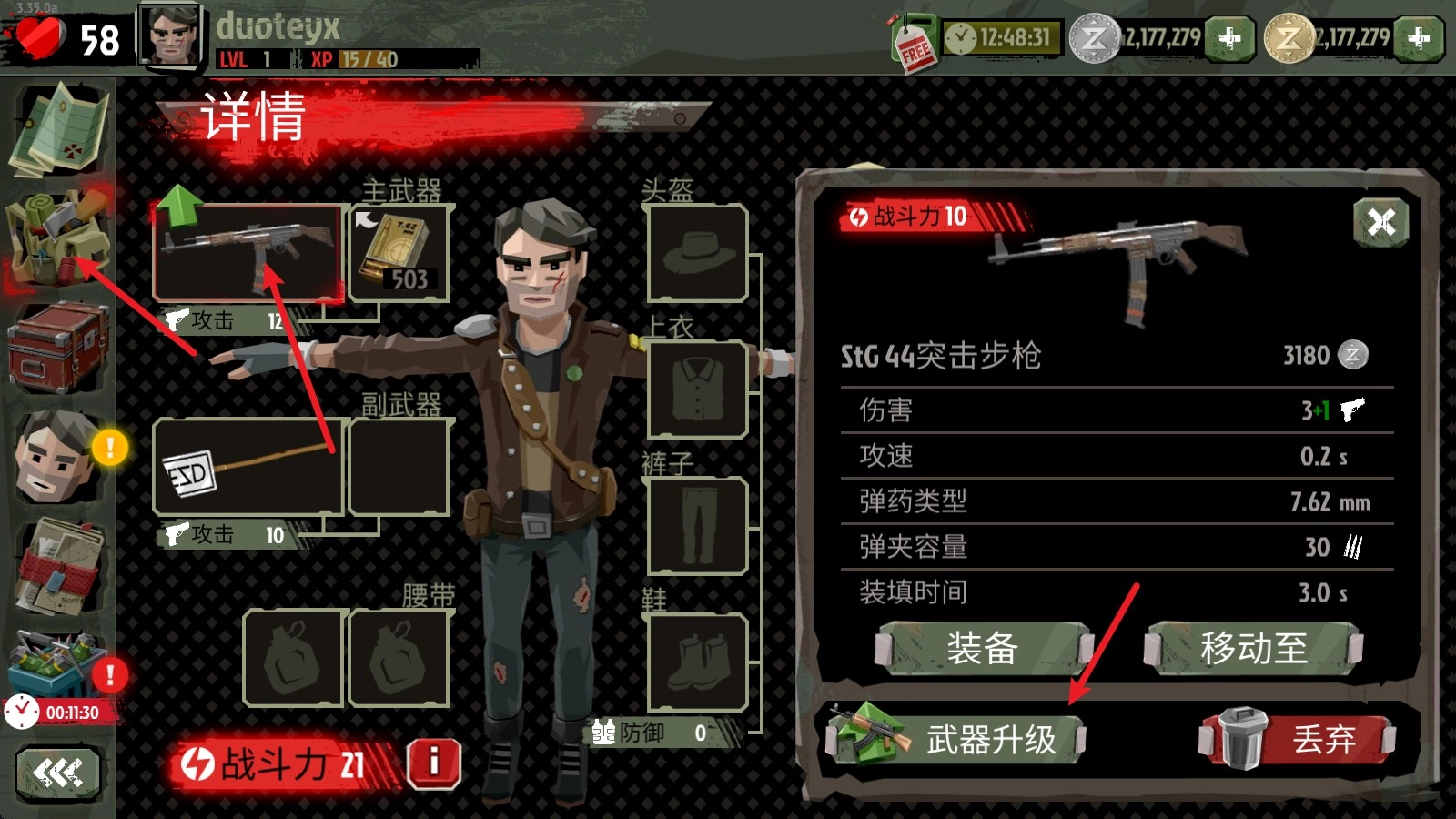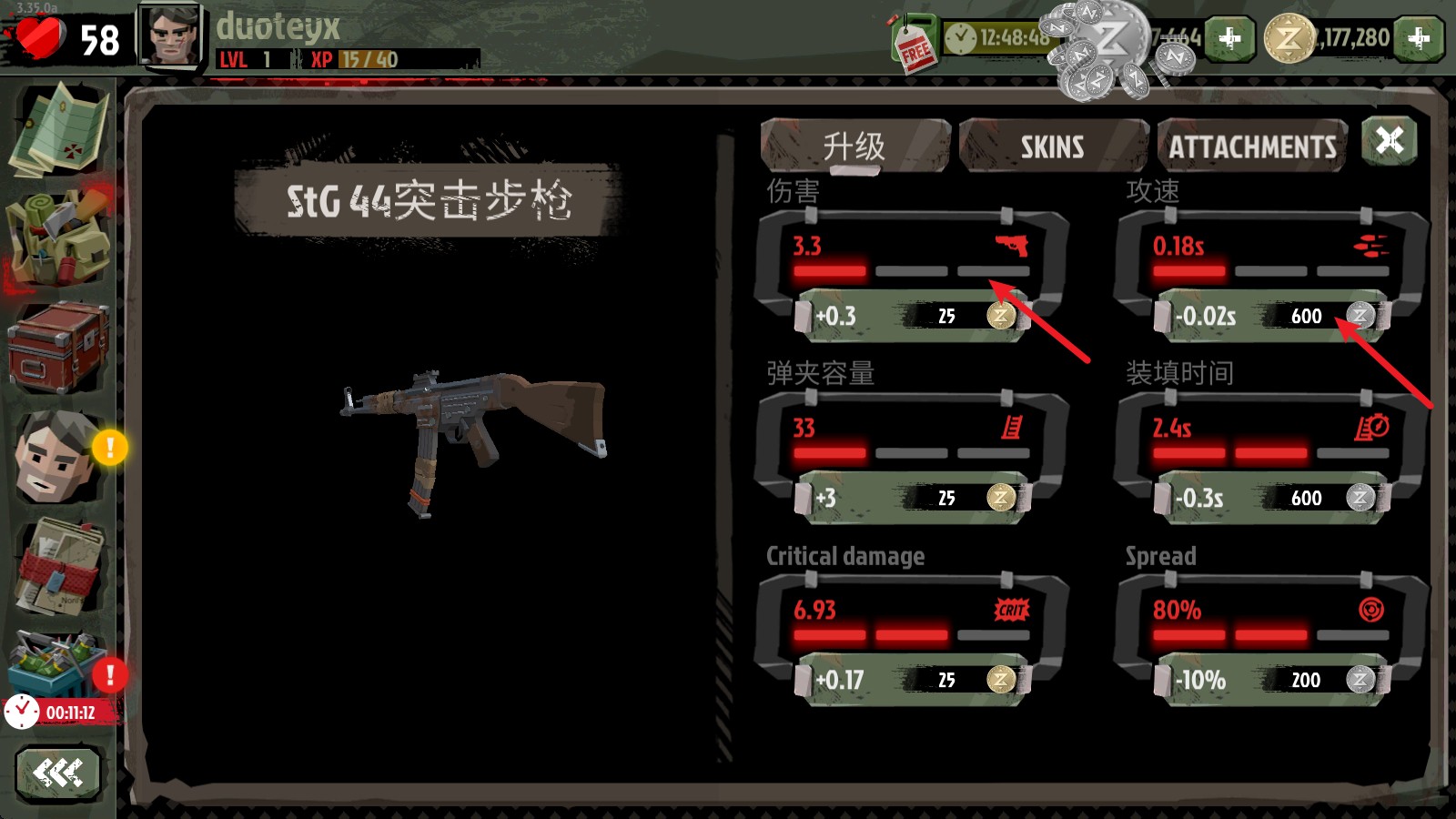 3、接下来,我们能够使用金币或者银币对自身武器进行升级。