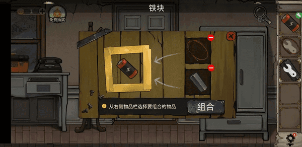 13、返回004房间,把钥匙插入保险柜。先点击左边,当波浪变成红色时,点击右边的光圈,连续正确操作三次即可开锁。打开保险柜后,取出密码本,接着把之前在地上捡到的徽章放入其中。开启后,拿到火钳。