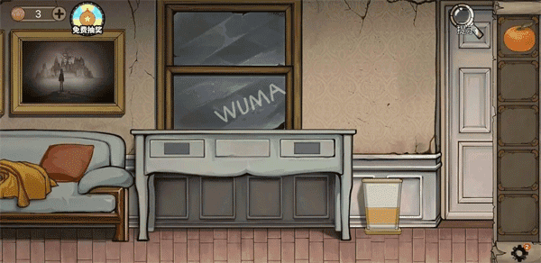 3、接着点击桌面上的食物。此时能在窗户玻璃上看到字母。利用这些字母来打开左右两侧的抽屉,左边抽屉按正常顺序“WUMA”打开,从中拿到钥匙,右边抽屉则以倒过来的“AMUW”打开,获取材料。最后用拿到的钥匙打开房门,走出去。