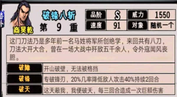 新S刀法破锋八斩随机施展其一,九重时攻击为1550,具备破格挡效果,自带2.5倍爆伤,有20%几率使目标减攻40%(持续2回合),每隔3回合触发2倍伤害(可与暴击叠加),详情如下图所示。