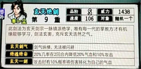 1、全新S级剑法玄天绝,施展时随机攻击一名目标,达到九重时攻击为1438,具备破闪避效果,自带2倍暴击伤害。此外,有20%的几率在2回合内,让目标的气血降低20%,攻击降低10%;还有10%的几率触发吸血效果(一旦触发,吸血比例为100%)。具体情况如下图所示: