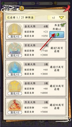 2、第一步,进入阵法界面。在此界面中,能够学习各类阵法并进行升级操作,其主要作用是提升祖星的生命与防御属性。