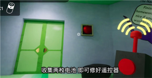 3、当收集齐两枚电池,就能把遥控器修好。随后走到绿色的大门前,会发现门的左右两侧各有一个红色按钮。