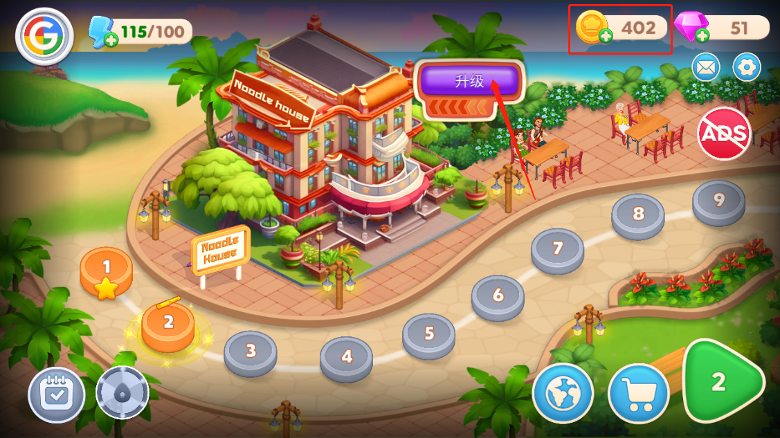 8、一旦收集到充足的金币,就能够对餐厅实施升级操作。