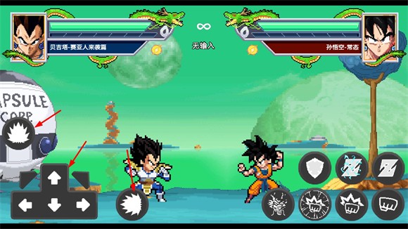2、进入战斗后,屏幕上会出现许多按键。先从左边说起,左下方是方向键,方向键中两个斜向上的箭头,能与其他按键组合成不同的连招。方向键上方是爆气按键,其右侧是追击按键,追击按键可与平A组成连招。