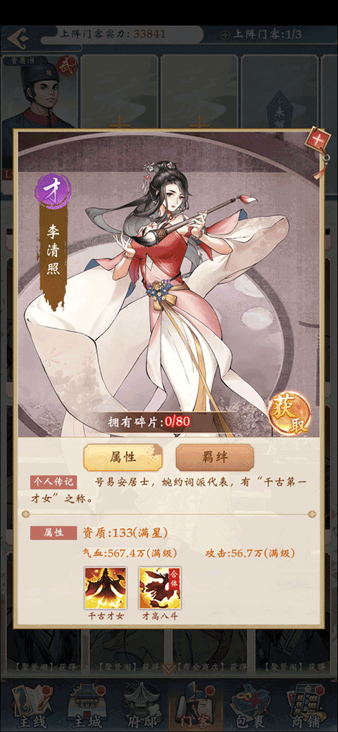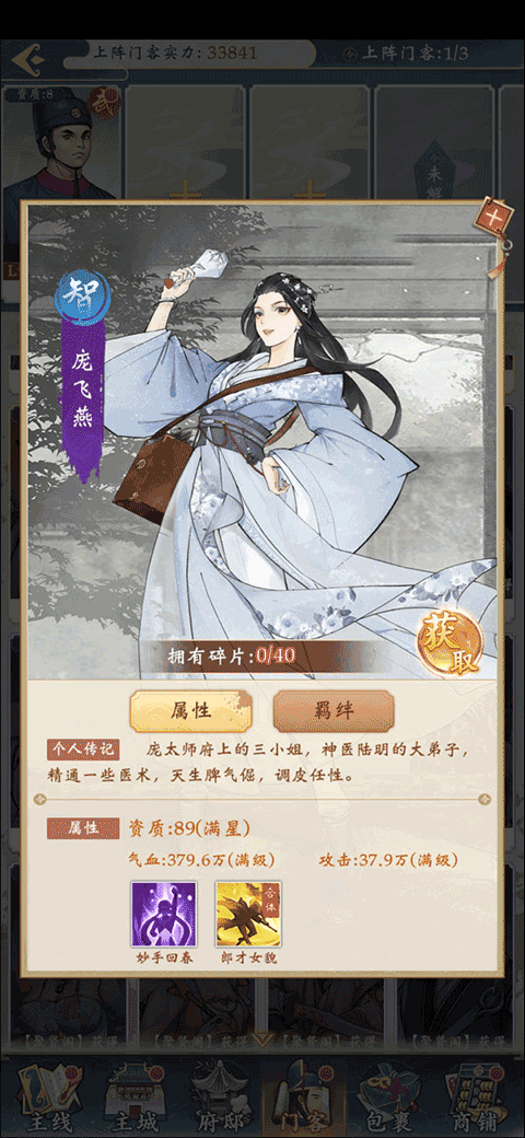 新手期一般会有4个蓝色门客。郭槐没有羁绊关系,因此可优先舍弃。刘娥和李宸妃在新手第一天的前期能配合着用,李宸妃还能继续使用。飞白居士和刘娥的羁绊门客都是橙色的,短期内不太容易获取,可根据实际情况选择弃用。